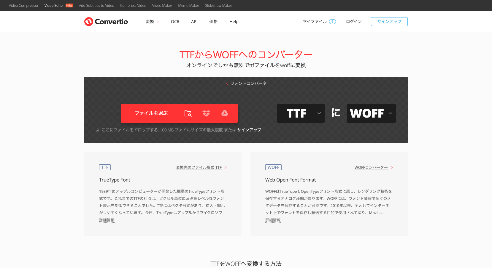 ダウンロードしたファイルはTTF形式なので、ファイルサイズの小さいWOFF形式も併用するときに、このTTFからWOFF変換ツールを利用しています。