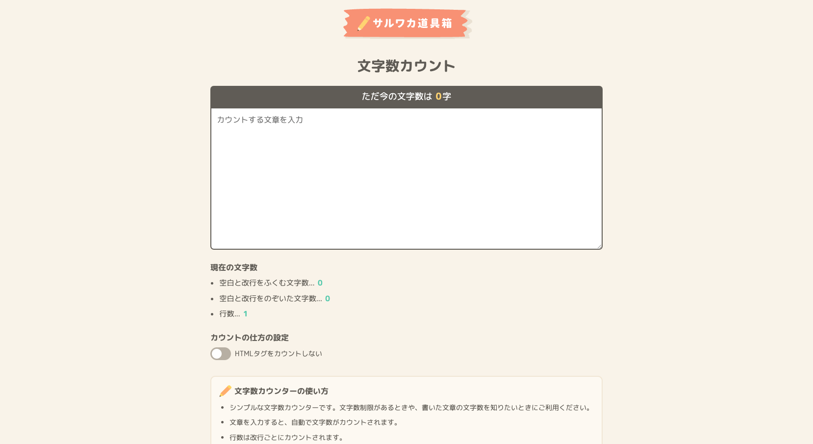 「空白と改行をふくむ文字数」「空白と改行をのぞいた文字数」「行数」が分かるのと、HTMLタグをカウントせずに文字数が分かるので、コーディング時でも気にせずそのままコピペできます。