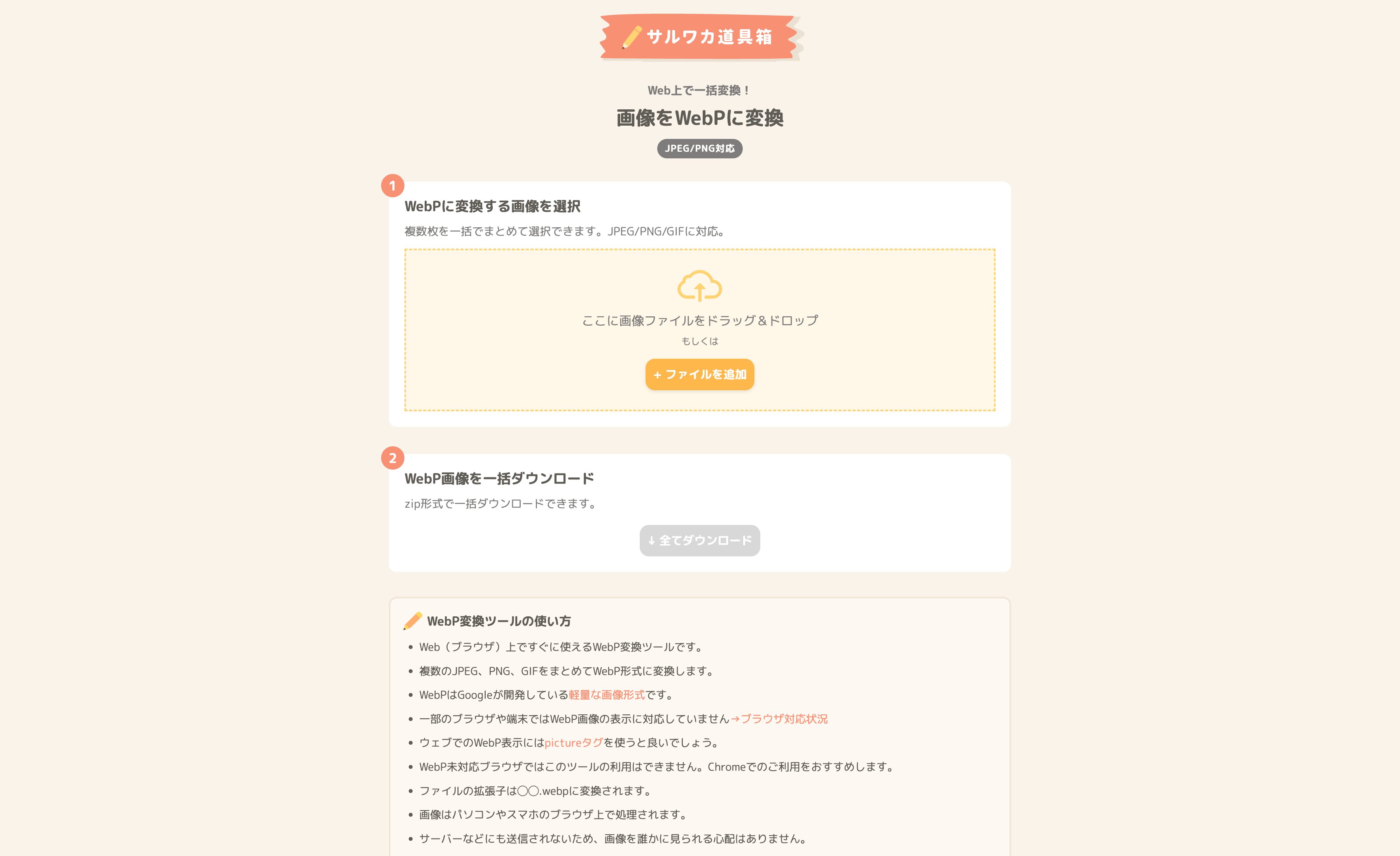 JPG画像やPNG画像をWebPに変換してくれるWebツール。