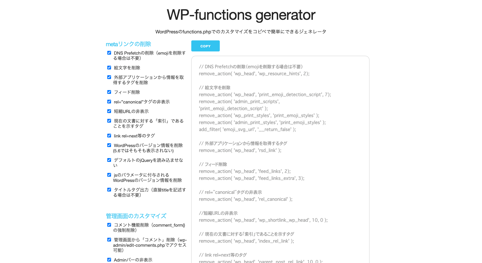 WordPressの「functions.php 」をカスタマイズできるWP-functions generatorツール。