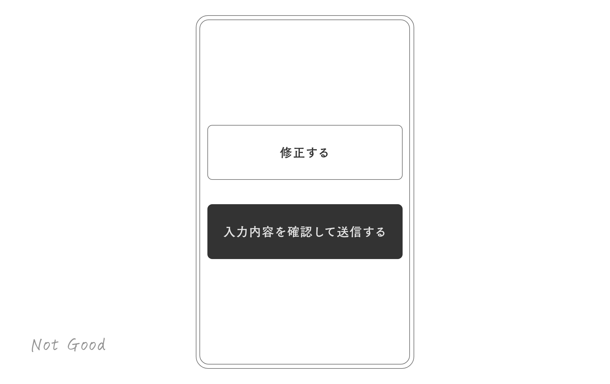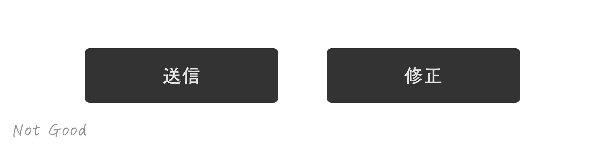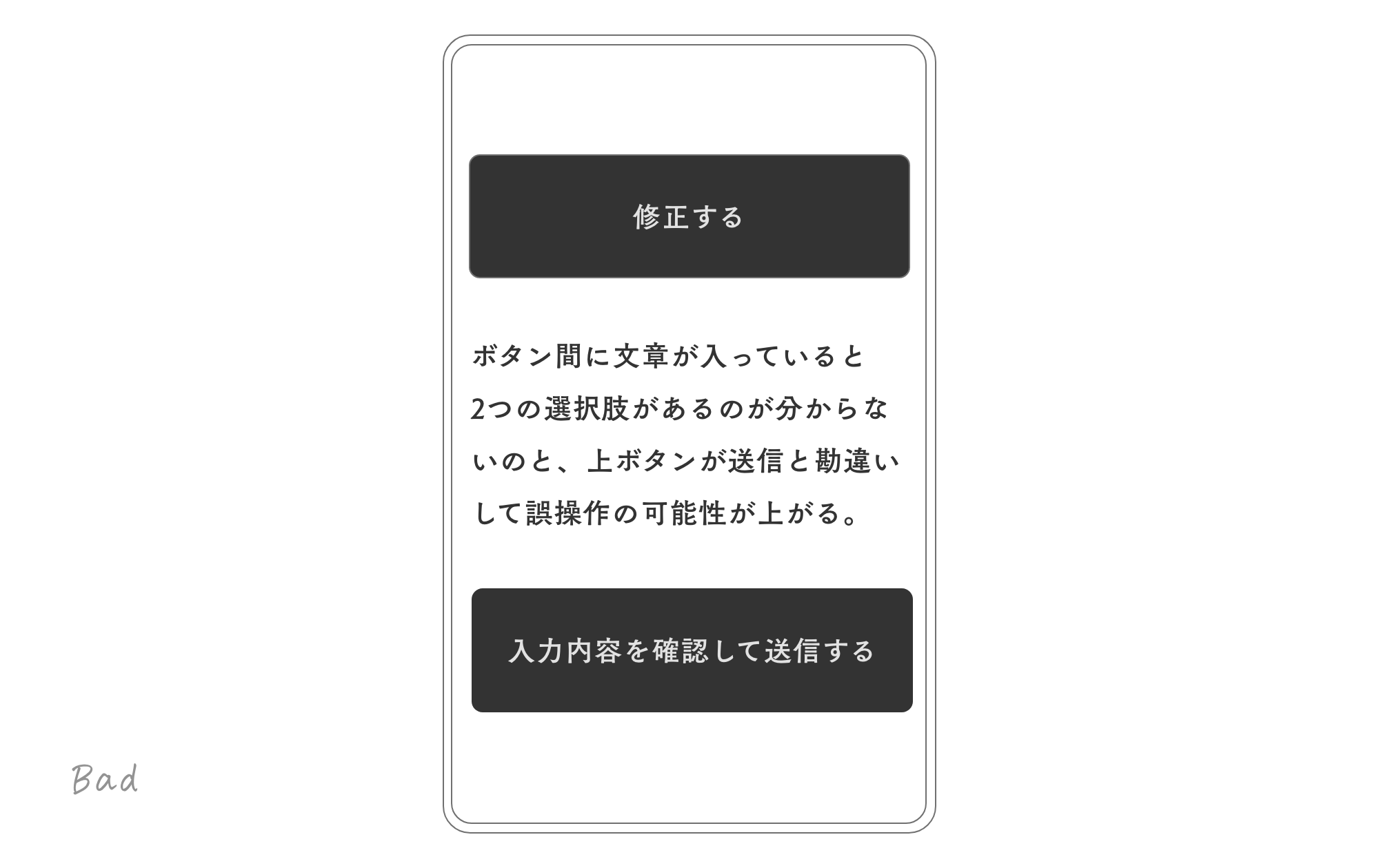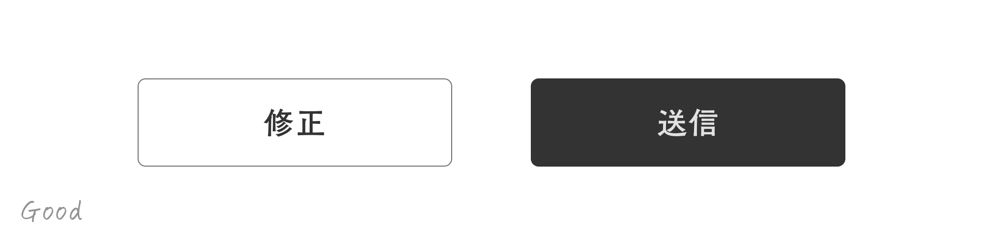 これは誤操作しやすいレイアウトです。「送信」「修正」ボタンは並べて配置し、明確にデザインを分け、誤操作しないようレイアウトしてあげましょう。