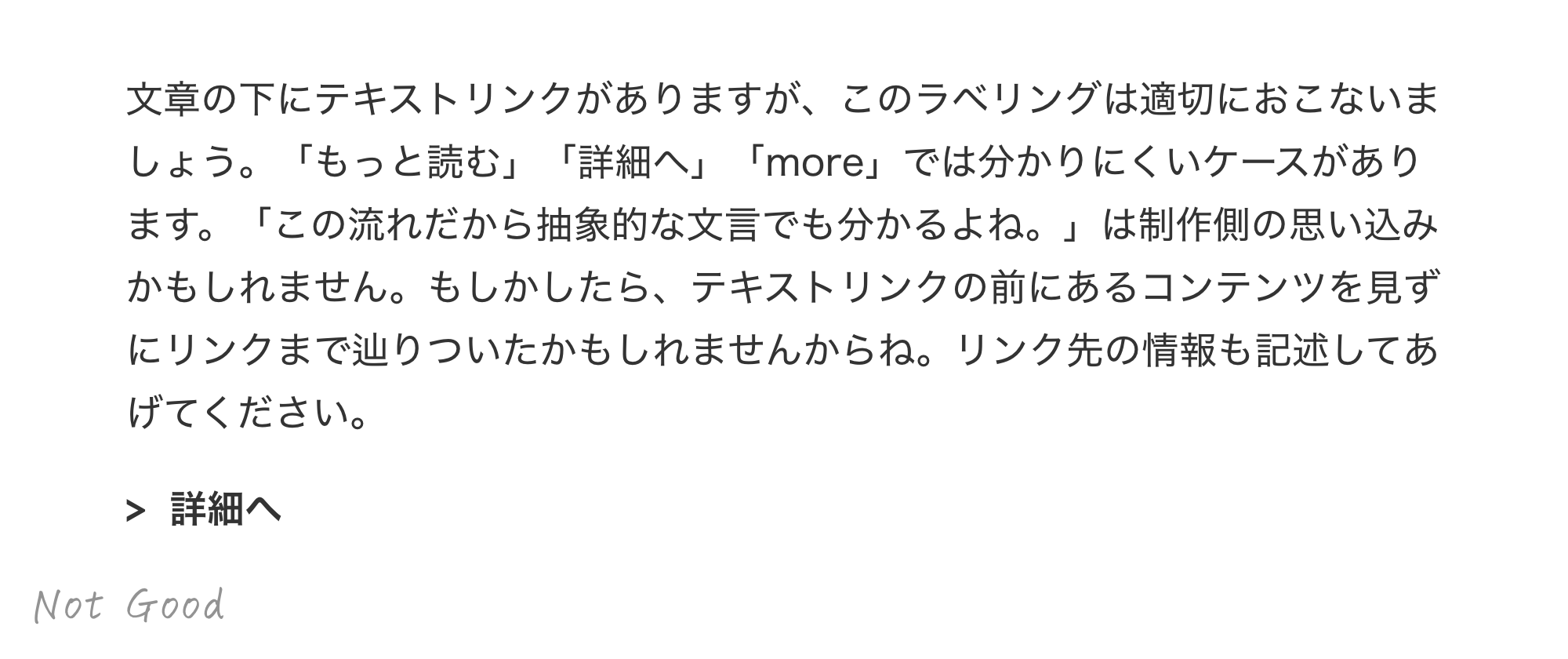リンク前後のコンテンツを見て認識した上で「詳細へ」のリンクがあればリンク先はイメージできますが、前後のコンテンツを見てない人も少なからずいます。