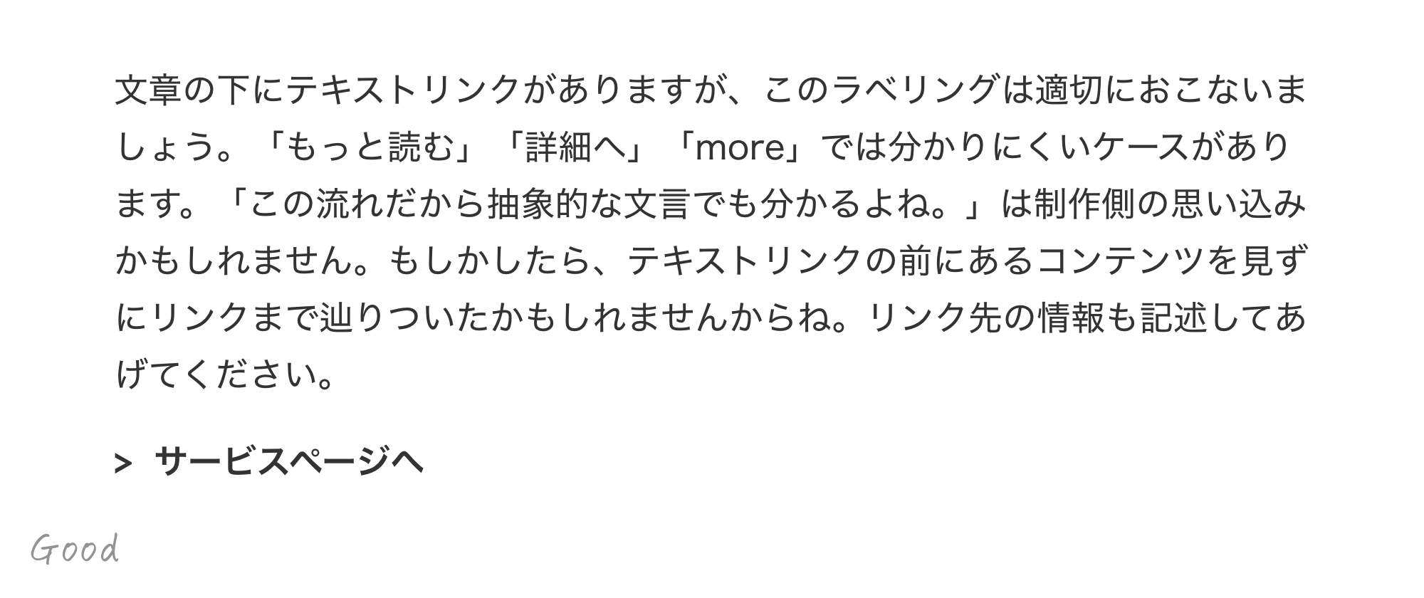 リンクのラベルはクリックした後、どのページへ移動するのか(もしくはどう変化するのか)を明示してあげます。